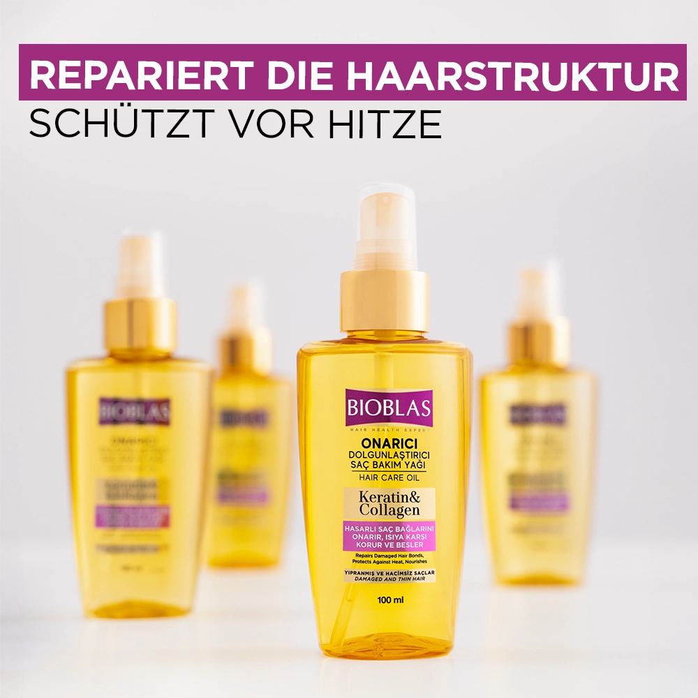 Angereichert mit Keratin und Kollagen, pflegt das Bioblas Haarpflege-Öl geschädigtes und kraftloses Haar sofort. Es repariert die Haarstruktur, stärkt das Haar von innen heraus und nährt es intensiv, ohne zu beschweren. Für Volumen, seidig-weiches Haar und einen gesunden, kräftigen und strahlenden Look.