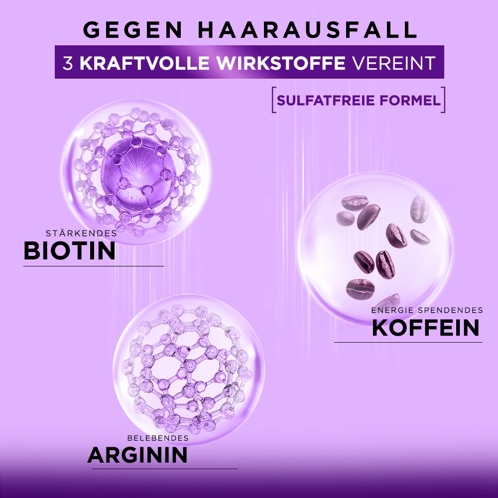 Die sulfatfreie Formel mit Biotin, Koffein und Arginin wirkt direkt auf die Kopfhaut. Sie pflegt das Haar von der Wurzel bis in die Spitzen und verleiht ihm neue Kraft. Das Haar fühlt sich dichter, kräftiger und gepflegter an.